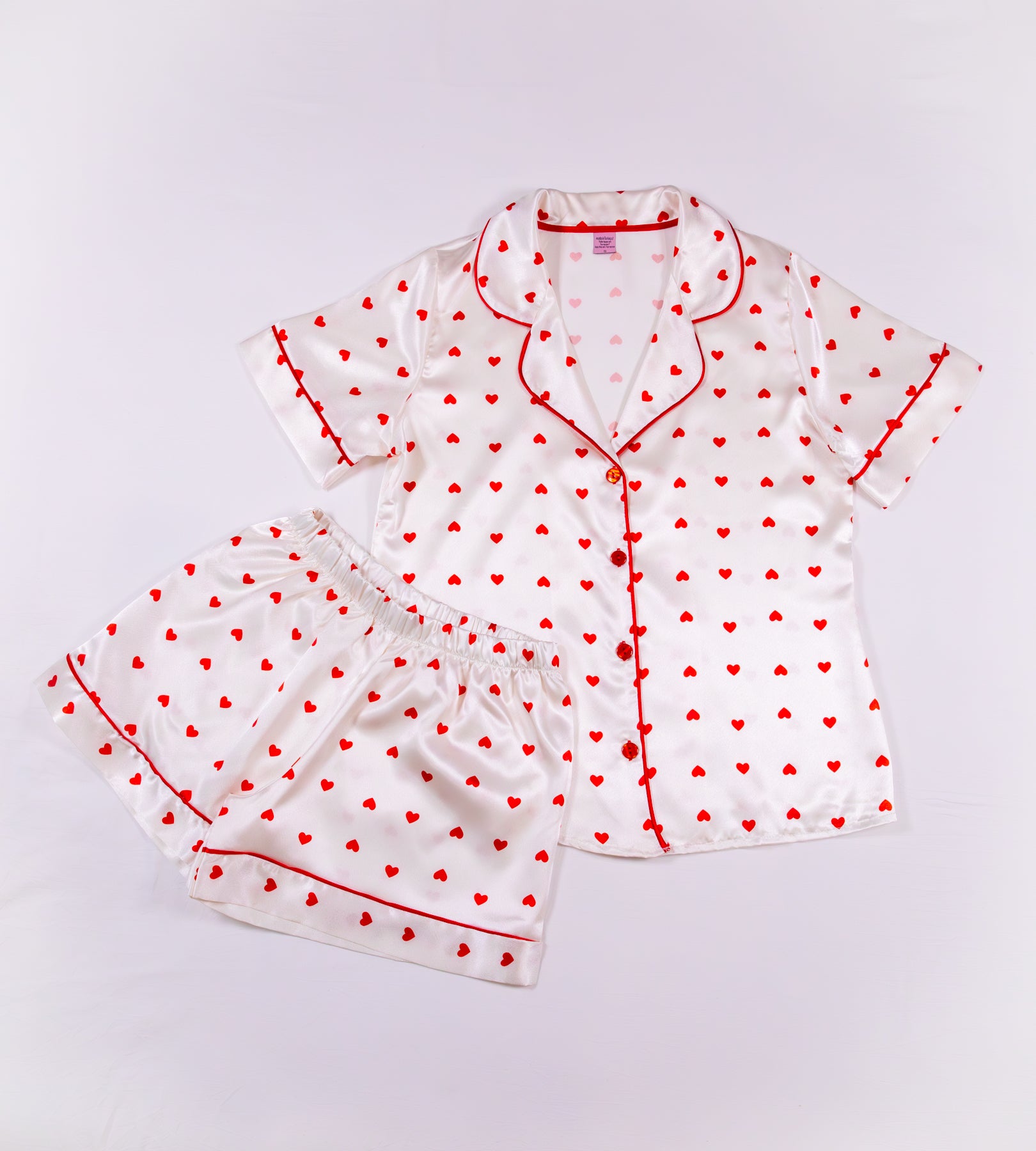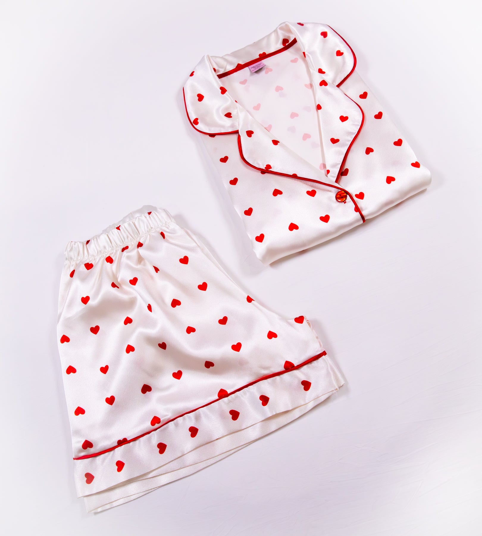A rich crimson satin set finished with delicate heart detailing. Romantic in tone, confident in presence — designed to linger long after nightfall.