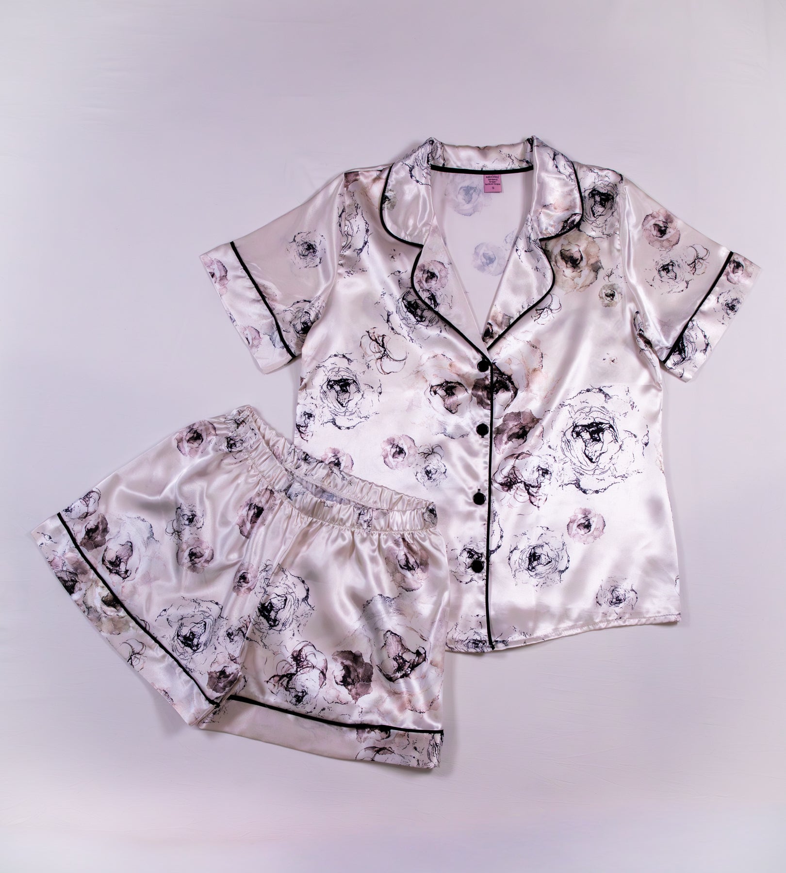 Soft ivory satin adorned with delicate floral detailing. Light, romantic, and quietly refined — a modern expression of softness.