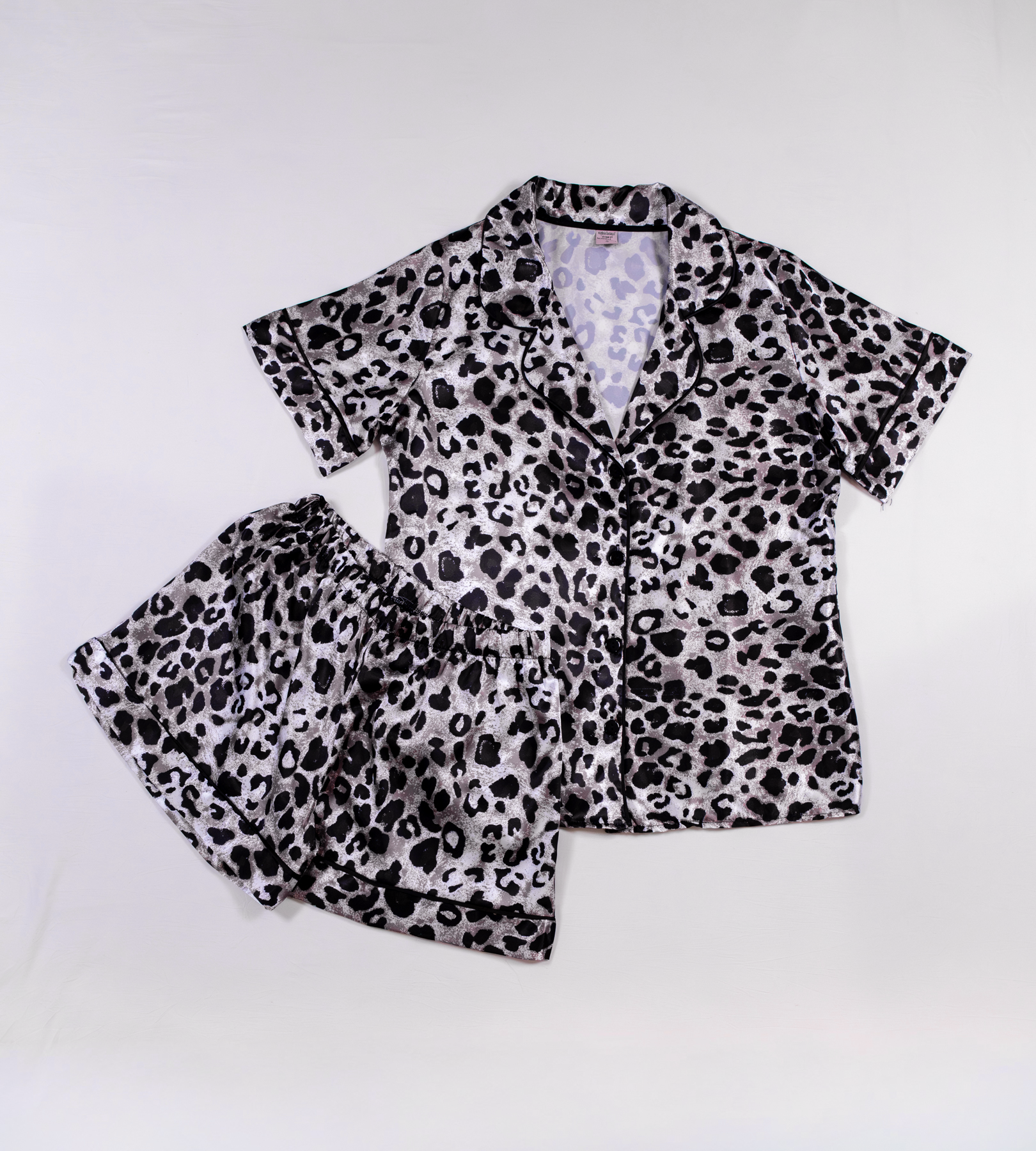Cool grey satin finished with tonal leopard patterning. Sleek, sharp, and quietly commanding.