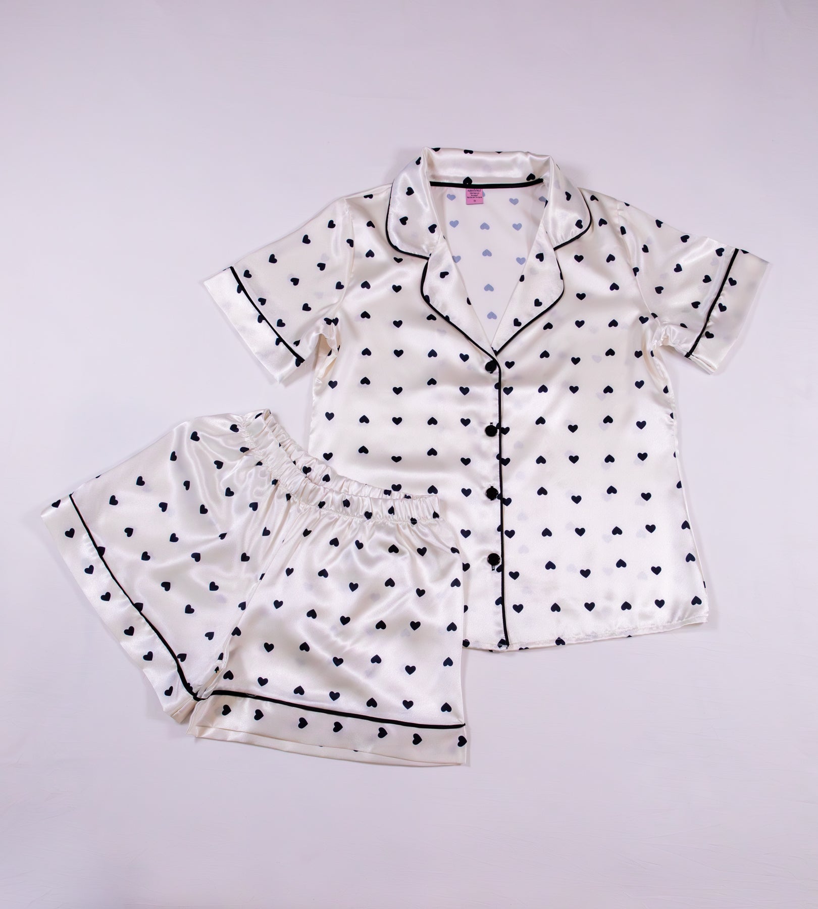 Black satin layered with graphic heart detailing. Darkly romantic with a twisted edge — bold, expressive, and unapologetically modern.